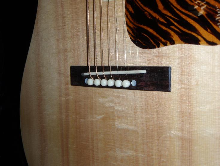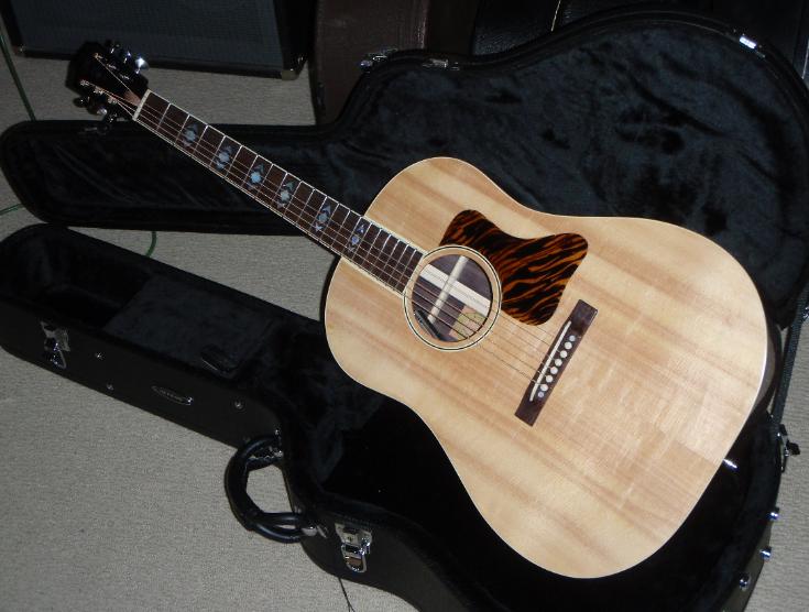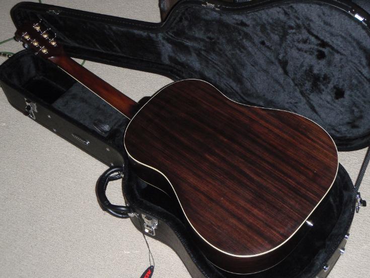 | SN 2009-16. Advanced Jumbo model. 25.4" scale. 1.75" nut. East Indian Rosewood back and sides, Lutz "Leopard Claw" spruce top, Ivoroid bindings, Honduran mahogany neck, ebony peghead veneer, East Indian Rosewood fretboard and bridge, mother-of-pearl fretboard and headstock inlay (Advanced Jumbo style), bone nut and saddle, ivoroid bridge pins, Gerven Tor-tis pickguard, K&K Western Mini electronics. |