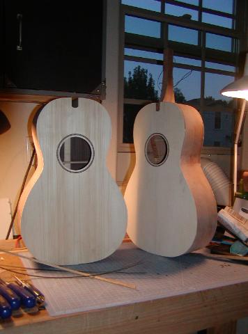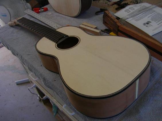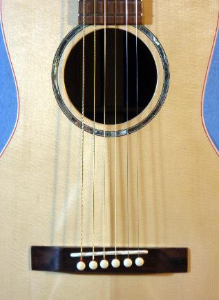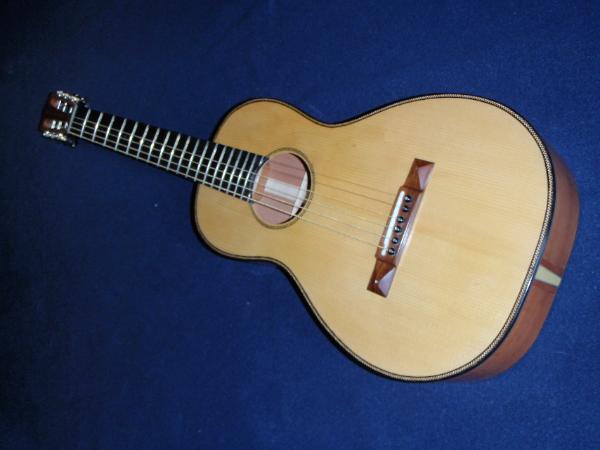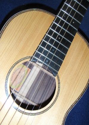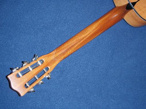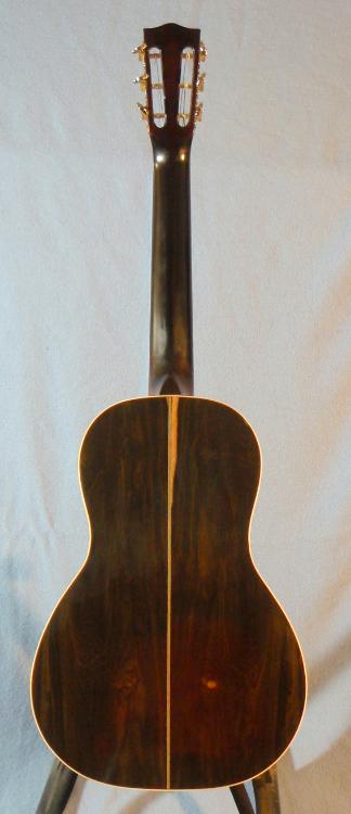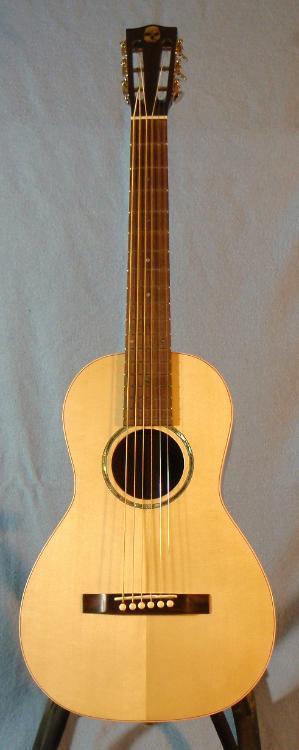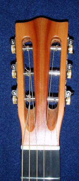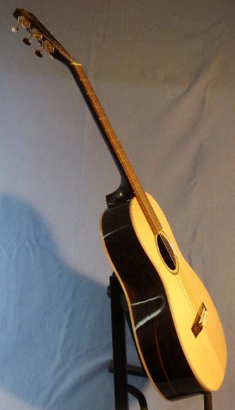 | Size 2 These guitars are modeled on a Martin 2-17 from 1929 or so. The Size 2 had been constructed since the mid-1800s, and the early ones were fancier than style 17. The 2-17 was the first Martin model to have steel strings, and it was quite popular in the 1930s. I copied a 2-17 owned by Keith Cary (luthier and musician of Winters California) that is in pieces. It has no sides, and because of its state, the bracing of back and sides, the pattern and dimensions of neck and tail blocks, etc., are laid bare. |