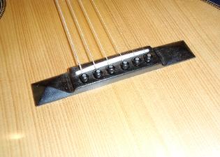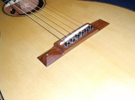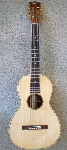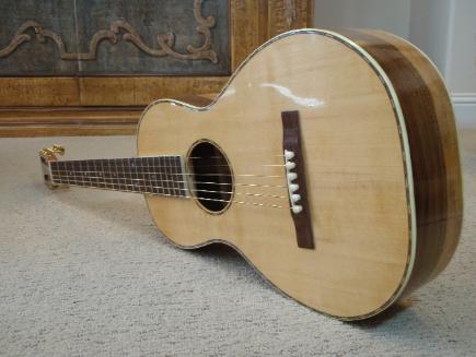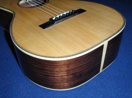 | No. 7 (below) Oregon madrone back and sides, madrone peghead veneer, ebony fret board and body binding, paua fret board inlay, herring bone purfling on top and back and around the sound hole, cocobolo pyramid bridge with paua embellishment, bone nut and saddle. No. 7 belongs to Matt Moller, of Petaluma, California. Matt is a highly trained musician (trumpet) and excellent guitar player. He is also Vice President, Engineering, Consumer Products, at Sonic Solutions (Roxio) |