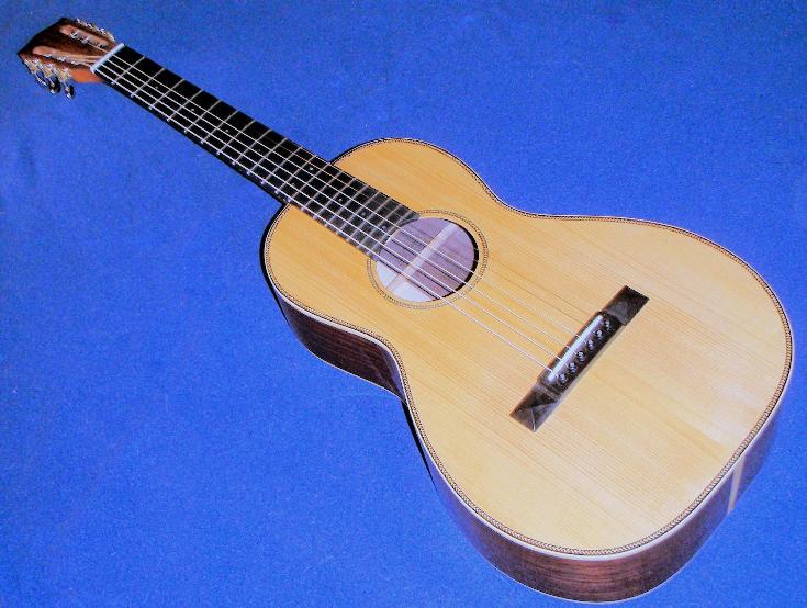 | No. 8 (below) East Indian Rosewood back, sides, and peghead veneer; Adirondack red spruce top with herring bone purfling; ivoroid binding and tail inlay; ebony fret board and bridge; paua fret board inlay; bone nut and saddle. No. 8 is owned by Steve Wilson of Davis, California. Steve is a gentle finger style guitarist and recently retired from a career as a conservator at the Crocker Art Museum in Sacramento. |
