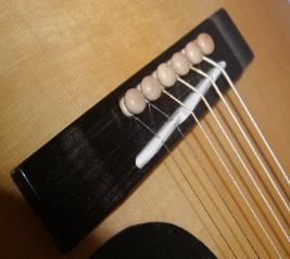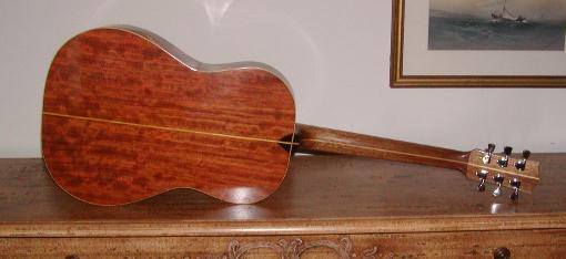 Bubinga back and sides, Sitka spruce top, Engleman spruce bracing, ebony peg head overlay, ebony fretboard and bridge, bone nut and saddle, ebony and maple high lights (back, tail, heel cap), maple bindings, mahogany neck with center lamination of maple. French polish finish.