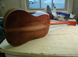 In 1965, my LG-0 died in a college dorm room accident, with the top split in many pieces, and the back cracked and broken. I kept the pieces in the case for 40 years until I could learn more about guitar repair, and then I rebuilt it. The rebuild required patching the back with a piece of the top, and I replaced the top with an X-braced cedar top. The bridge, neck, sides, back braces, and most of the back are still original. The original tortois bindings are replaced with Gibson-like white plastic.