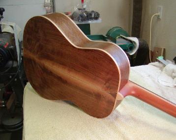 Black walnut back & sides, "red bear" Lutz spruce top, Honduran mahogany neck, ebony fret board, cocobolo bridge, bone nut and saddle, maple bindings and heel cap, Engleman bracing.